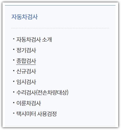 • 종합검사: 종합검사 대상 지역에 등록된 일정 차령(차의 나이)이 지난 모든 자동차가 일정기간마다 받는 정기적 검사